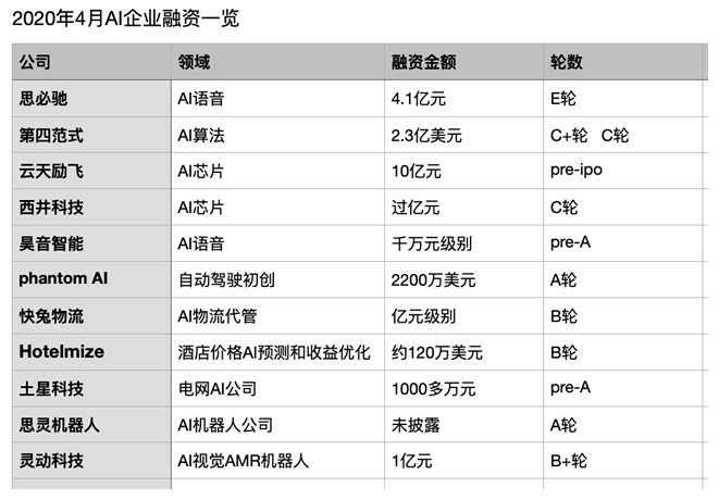 2020一场疫情的来临,给整个经济体系带来了不少的冲击。然而人工智能虽受疫情影响,但是整体的需求和热度却在上升,对比前两年的遇冷,今年更像是觉醒时期,要从谷底向上攀升。4月开始,人工智能领域内的融资潮还在继续。据不完全统计,已经有11家人工智能企业获得融资。